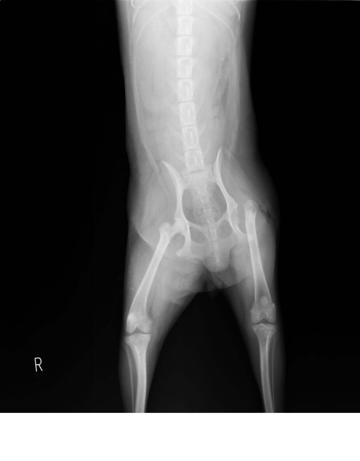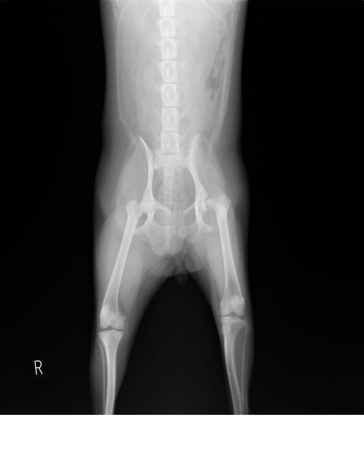 約1ヶ月続く左後ろ足の跛行を主訴に、他院さんから紹介受診されました。レントゲン検査、臨床症状、若齢であることなどから無菌性大腿骨頭壊死症と診断し、大腿骨頭骨頸部切除術を行いました。現在リハビリ中ですが、順調に回復中です。