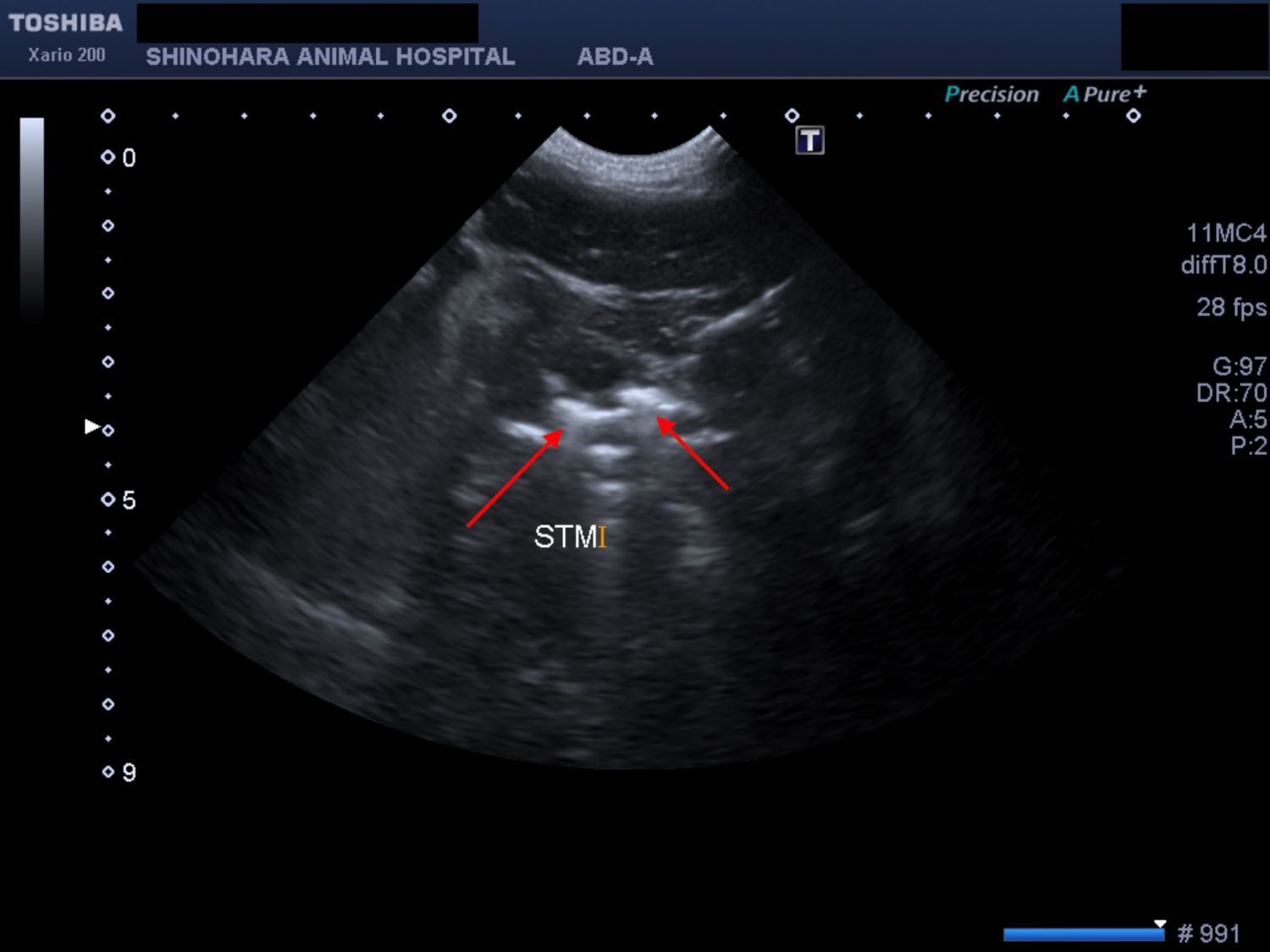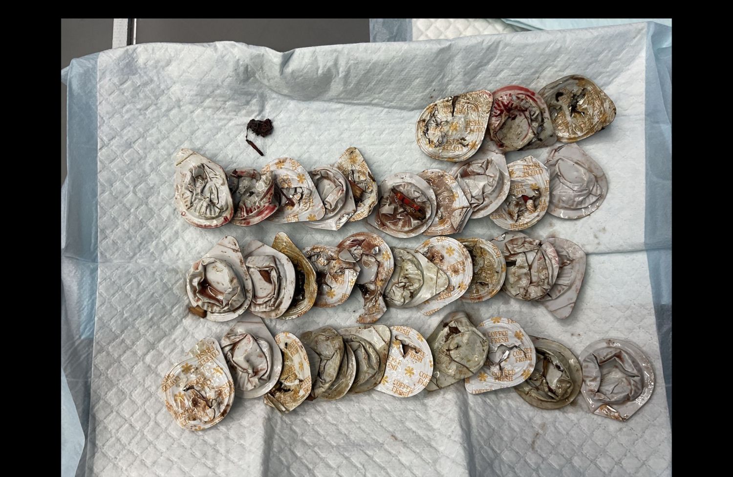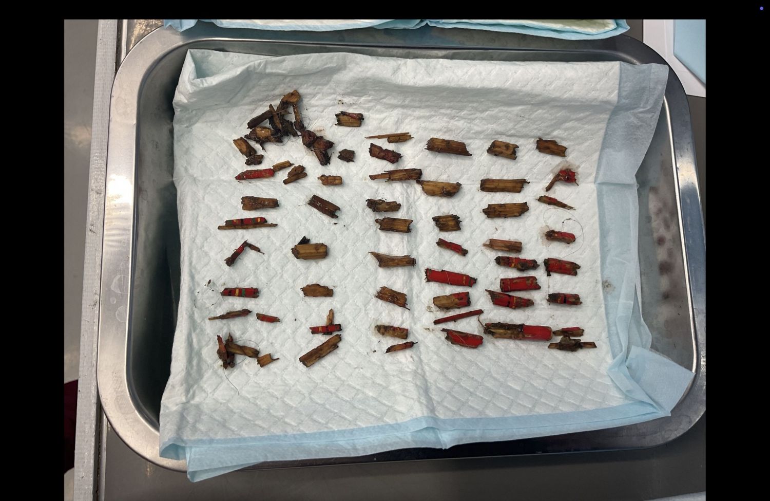 前日の夜間にコーヒーフレッシュを食べ、その後から複数回嘔吐と食欲低下があることを主訴に来院されました。エコー検査で胃内に異物を疑う所見があったため、内視鏡検査を実施しました。内視鏡検査で胃内に大量のコーヒーフレッシュを確認しましたが、あまりにも量が多く内視鏡での摘出は不可能と判断し、そのまま胃切開術を実施しました。コーヒーフレッシュ以外にも、菜箸の破片やスポンジなどが摘出されました。